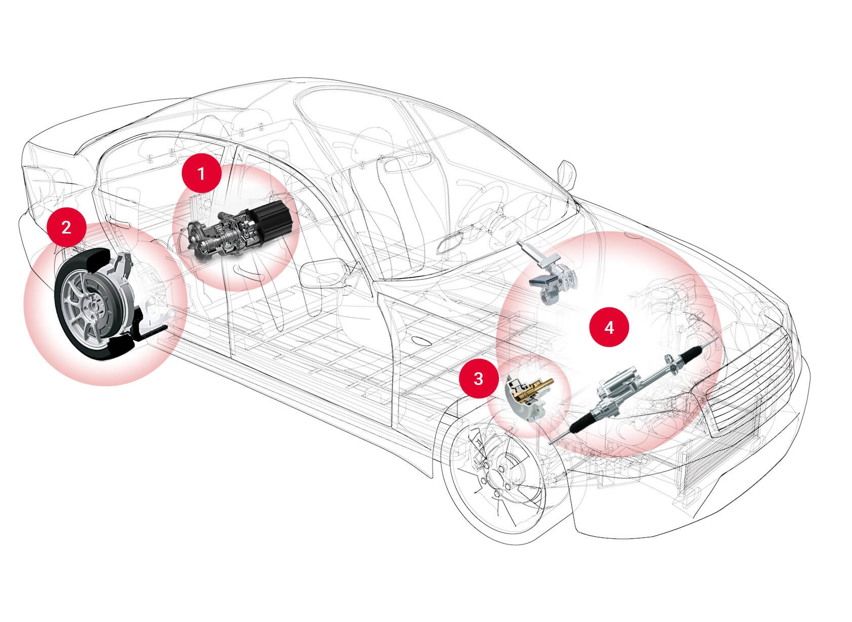 3Ball Screw Actuator for Electric-Hydraulic Brakes  A low-friction ball screw improves brake response by enabling reliable high-speed operation and precise control. Integrated bearings and peripheral parts achieve compact size and low weight. The increased safety delivered by this product will contribute to the development of electric vehicles (EVs) and hybrid electric vehicles (HEVs), as well as to autonomous driving.