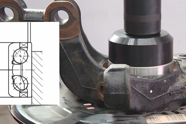 • Das Lager muss mit der Achsschenkelbohrung in Flucht bleiben und wird vertikal in den Achsschenkel gepresst.