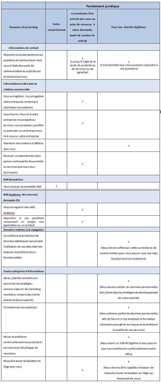 • la société NSK compétente - en ce qui concerne les  autres données collectées dans le but de vous fournir à vous et/ou à votre entreprise des services ou envoyer une communication marketing/commerciale (dans cette politique le responsable du traitement de vos données personnelles est aussi désigné comme « NSK Europe », « nous », « notre », « nous »”).
