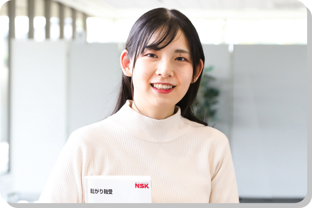 NSKに就職を決めたのは、インターンが楽しかったことと、部品や機械要素に関わる仕事がしたかったから。内定者研修でも、先輩社員から職場の雰囲気などを聞けていました。今は工場のIoT化の仕事をしています。配属された時はシステム系で大丈夫かな?と不安もありましたが、先輩や周りの人は分からないことがあればすぐに教えてくれるし、相談しやすいです。機械や設備の知識を生かしつつシステム構築という未来への挑戦が出来て、忙しいけど楽しく働いています